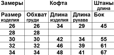 Размерная сетка. Костюм шьется в размерах с 26 по 34 размер.